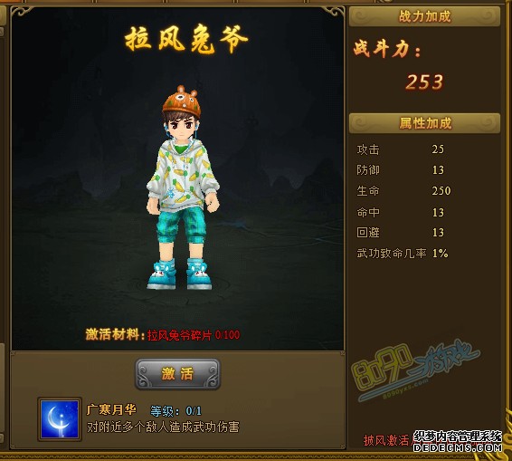 在游戏中这个披风玩家需要用1288元宝在中秋节活动中进行购买,并且目前只能购买一次,后续的进阶可以用中秋节掷骰子的活动来凑剩余的披风碎片。这个披风激活就可以为玩家增加253点战斗力,属性方面可以增加25点攻击力、13点防御、250点生命值、13点命中、13点回避和1%的武功致命几率。