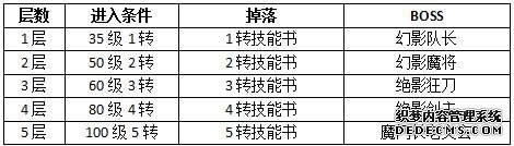 3.每一层有小怪、精英若干和一个BOSS,掉落各职业技能书